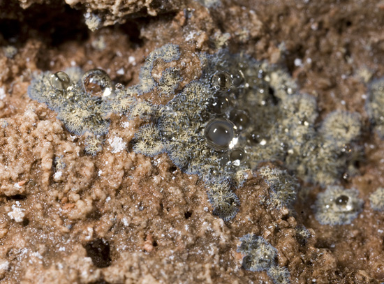 A brown jelly like cyanobacter seen outside cave entrances is Nostoc sp. This occurs as both a free living cyanobacter and in association with a fungi to form a lichen. When wet it swells up hence its name, jelly lichen. It is a photobiont that cannot survive on acidic rocks like granite and quartzite