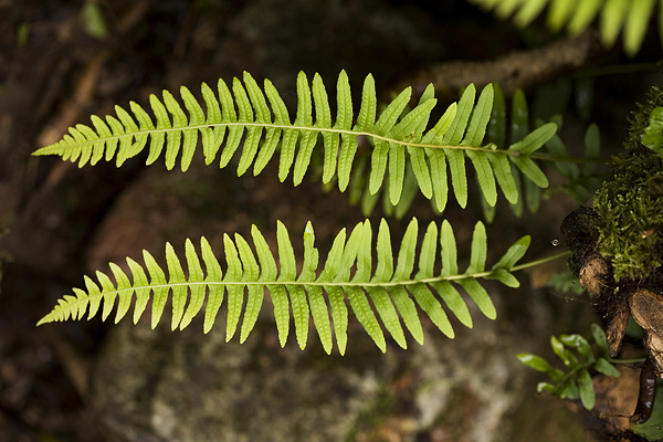 Some species prefer more acidic conditions than can occur around cave entrances. The Mountain or Lemon-scented Fern (Oreopteris limbosperma) prefers acid conditions but can be found on limestone in moist, peaty woodland soils or where the lime has been leached from the soil. Hard Fern (Blechnum spicant) may be found on steep, damp, humus rich pockets, for example where water running down from more acidic conditions higher up causes leaching and results in conditions too acidic for the Shield Ferns or the Harts Tongue Fern. Due to their habitat requirements both these species are more likely to be found around mine entrances on Dartmoor. Lady Fern (Athyrium filix-femina) is another good indicator of more acidic conditions.