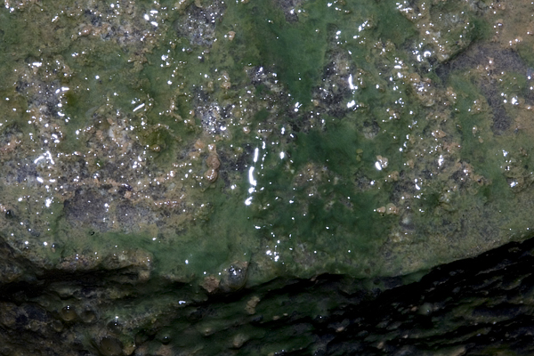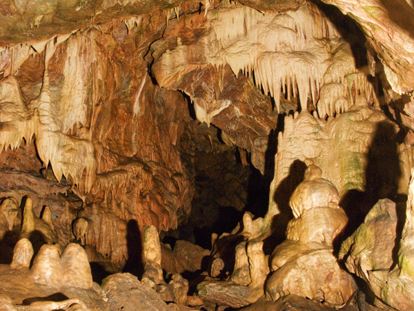 Kent's Cavern. Patches of green algae can be seen growing on the flowstone. |