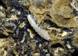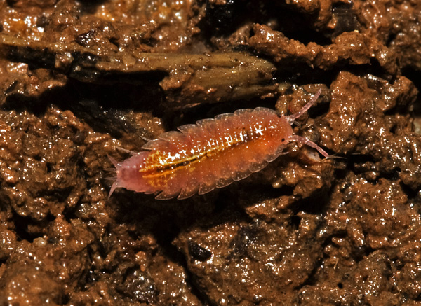 The Common Shiny Woodlouse, Oniscus asellus, is common in caves and has been identified from Elm Cave, Lamb Leer Cavern, Mouse Hole and others. Another species, Trichoniscus pygmaeus has been recorded from Elm Cave. Woodlice are usually near the thresholds of caves. One woodlouse, Androniscus dentiger, appears quite happy in the cave – it is a more delicate pink colour than the usual woodlouse and is frequently found under stones and in rotting piles of wood (and outside in your compost heap). It has been widely recorded from many caves on the Mendips.