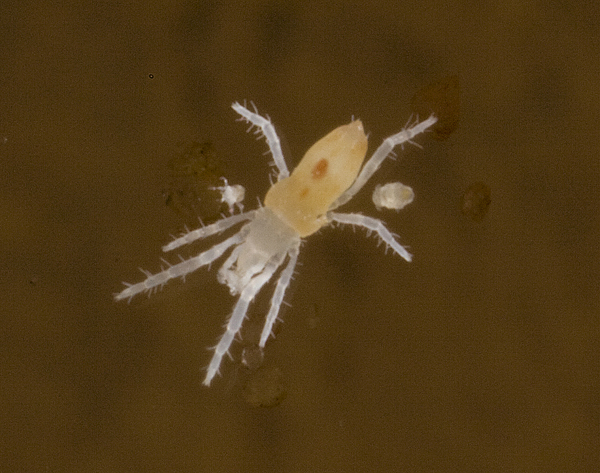 Rhagidia sp. mite in Withyhill Cave. The other creatures in the photograph ar springtails. |