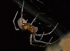 There a number of small spiders belonging to the Linyphiidae family ('money spiders') e.g. Neriene sp., Porrhomma sp. that are found in caves. Porrhomma.convexum is common and has been recorded from Blake’s Farm Cave, Sidcott Swallet, Stoke Lane Slocker and Swildon’s Hole. P. egeria has been recorded from Elm Cave and Goatchurch. Porrhomma sp. webs are often in obscure cracks and crevices in the walls of the cave, and the spiders even harder to spot. Other 'money spiders' include Lophocarenum nemorale, Lessertia dentichelis, Erigone dentipalpis, Centromerus prudens and three species of Lepthyphantes: L. pallidus, L. zimmermanni and L. ericaeus.
