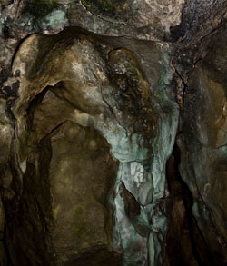 Cyanobacteria (formerly known as blue-green algae due to a blue photosynthetic pigment, phycocyanin) are an ancient group of organisms and live in many places where nothing else can survive. There are fossils of cyanobacter dating back for nearly 4 billion years when our climate was very different. Cyanobacter are easily seen in the thresholds of caves or in show caves where there is some light and moisture. They are best seen in dimly lit areas growing on the rock, in these areas the levels of light are too low for eukaryotes (multicelled organisms) to survive. They appear in a variety of colours, in fact any colour other than bright green. They are typically blue-green, blue-black or black. Secondary pigments may colour them yellow, brown, red, purple.