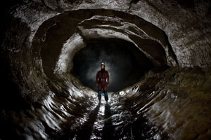 Humidity is constant and very high, usually between 98 and 100%. Near entrances with draughts it may drop to 75%, this is still much higher than the lowest levels recorded outside the cave. The draughts change direction depending on the outside weather. Air moving into the cave in winter may be at a lower temperature than the air in the cave - it will warm up and be able to hold its water vapour. In summer the air flowing into the cave cools down and becomes saturated with water vapour, it condenses on the walls and ceiling of the cave.