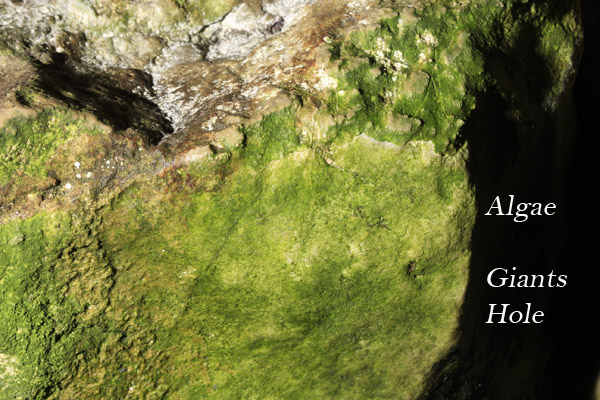 This can be seen growing on the walls and roof inside cave entrances, as the light dims further into the cave so they become restricted to surfaces facing the entrance. They are usually green due to the photosynthetic pigment chlorophyll.