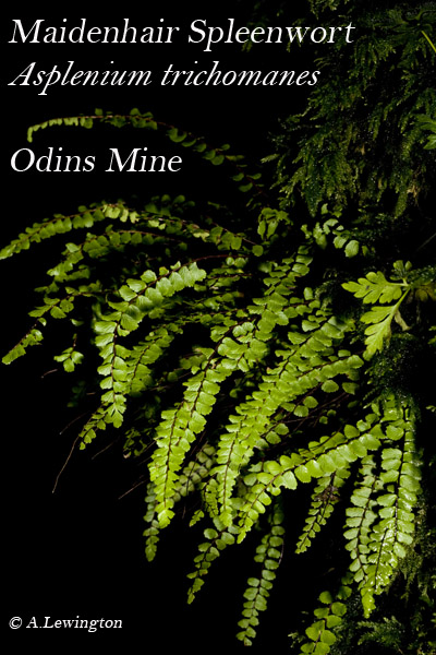 With bright light and good drainage Wall Rue Asplenium ruta-muraria may be seen, it is also common on man made habitats such as mortar. Maidenhair Spleenwort Asplenium tichomanes (this has a dark stem) is common in cave entrances, whilst the strongly calcicole, alpine Green Spleenwort Asplenium viride (with a green stem) is found above 300m.