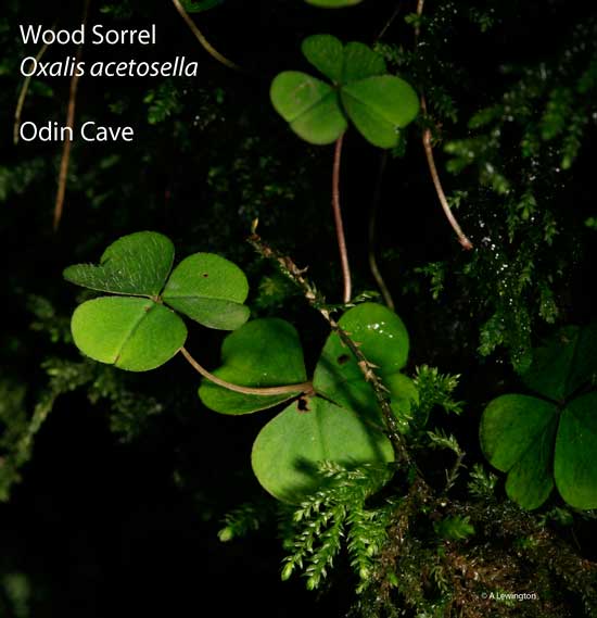Shade loving plants (sciophytes) will grow around the entrances of caves. There are three species of flowering plant commonly found in cave entrances that can cope with light levels down to 24 lux – Herb Robert Geranium robertianum, Wood Sorrel Oxalis acetosella and Opposite Leaved Saxifrage Chrysosplenium oppositifolium.