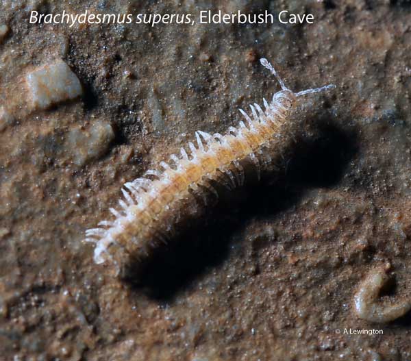 Brachydesmus superus is small, pale (cream/white) and has been recorded in Bagshawe Cavern. It is considered caverniculous.