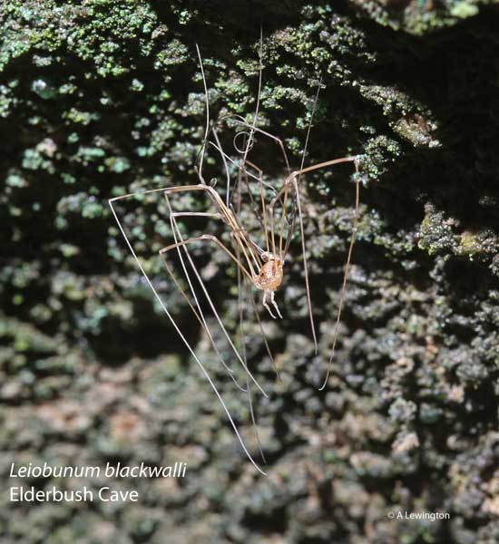 Harvestmen (Opilionida) have been recorded from the threshold of caves including Mitopus morio. They are accidentals, their true habitat being the matted grasses and loose soils around the entrances. Harvestmen do not make webs and lack venom, they are scavengers on dead and also soft bodied invertebrates.