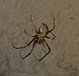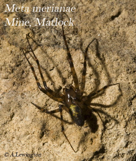 Metellina merianae (formerly in the genus Meta) is found in the threshold, often at the entrance itself where it spins an orb web to catch creatures flying in and out of the cave. The webs are spun across the passage and so are more obvious. Outside the cave the webs are built at night to catch Nematocera gnats. It is a similar shape to Meta menardi, but is smaller, lighter brown with dark spots on the legs. It is generally found in the shallow threshold zone, whilst Meta menardi is often found deeper in the cave. The two species are frequently recorded from the same caves.