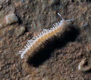 The other common caverniculous species is the Spotted Snake Millipede Blaniulus guttulatus recorded in Cumberland Cavern and Dido's Cave. The spots down the sides are stink glands.