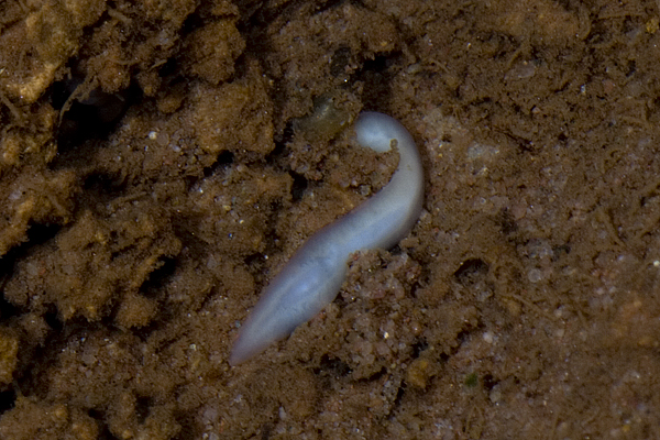The white Dendrocoelum lacteum (14-25mm, found in Dan yr Ogof) is relatively big and fast (for a flatworm) and has a psedudo-sucker to help capture prey such as the isopod Proasellus cavaticus; they are often found together. It breeds in the spring and dies in the summer after producing cocoons.