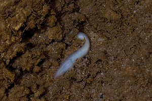 Flatworms are simple white or brown flattened worms and move about their damp habitat by a series of undulations. Most flatworms are free-living, many are parasitic, but the larger ones found in caves are predators. Although simple they have a bilateral nervous system and the head end of some species even has a rudimentary brain to integrate signals from eyespots. Some have the ability to continue to grow as two flatworms when cut in half - the bit that had the tail grows a new tail and its tail becomes the head.