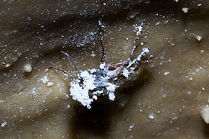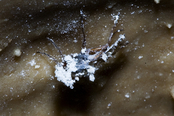 Most fungi are associated with soil and plants but some are found as saprophytes and parasites on cave invertebrates: Paecilomyces on dead insects has white stalks with white powder like conidia; both Beauveria (a white mould) and Hirsutella (white slender fingers) attack live insects – the latter is often found on the fly Heleomyza serrata. Hirsutella is also a parasite of nematodes - some fungi actually trap and hunt nematodes and springtails and can be regarded as predators.