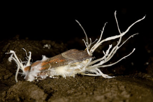 Fungi sprouting from Herald Moth, Ogof Capel |