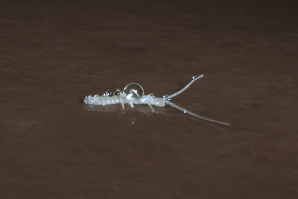 Diplurans ('two tails') are primitive eyeless insects with segmented antennae that generally live underground in soil and leaf litter. They resemble white earwigs and live on prey and dead organic matter including springtails and fungi. They are unusual in that they are able to regenerate lost body parts. On some species the tails (cerci) are used as pincers, the one in the photograph has very small tails and long antennae and has a droplet of water on its back.