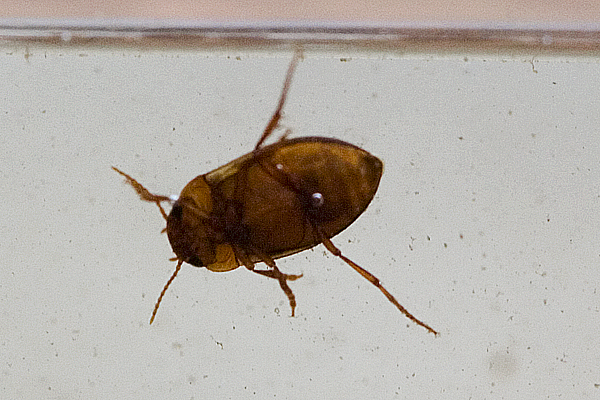 Water and diving beetles are found in caves, this photograph is of a diving beetle found in a gour pool at the bottom of the creek in Porth yr Ogof, probably washed in during a flood.