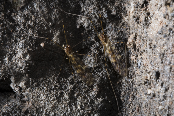 Family TRICHOCERIDAE Crane Flies. The Winter gnat or crane fly Trichocera maculipennis (8mm) can be found quite deep underground in large cave systems such as Agen Allwedd and Ogof Ffynnon Ddu along with its yellowish larvae. The adult is widely distributed but rarely seen, the larvae are attracted to baits such as rotting meat. It looks like a very small, delicate crane fly.