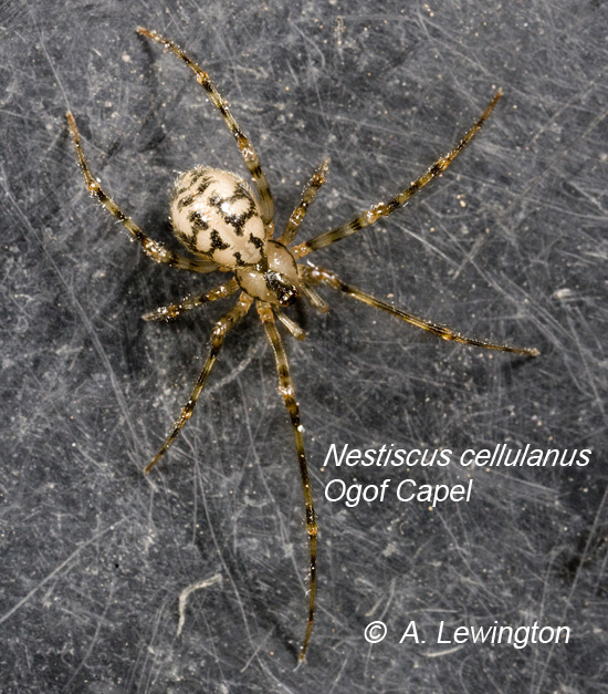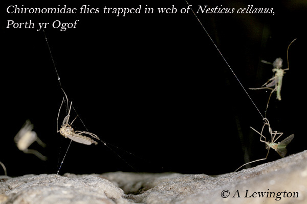 There a number of 'money spiders' (e.g. Porrhomma sp.) found in caves. P.convexum is common – but there are few records in Wales. In the dark zone of Ogof y Ci you may find Britain’s only troglobitic spider, Porrhomma rosenhaueri. It is a straw coloured blind spider – but it is only 2mm long and probably hiding in a crack so you will have to look carefully to find one. Other 'money spiders' include Lessertia dentichelis and Lepthyphantes pallidus. Porrhomma sp. webs are often in obscure cracks and crevices in the walls of the cave, and the spiders even harder to spot.