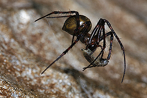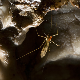 The familiar cave spider is the large Meta menardi. The spider needs space to spin the characteristic orb web which is small considering the size of the spider. It is a large, dark brown, troglophilic cave spider that prefers to inhabit dim areas and areas where the light is reflected. It also appears to be slightly deeper in a cave that has two entrances close by, and in winter. Some arthropod troglodytes move towards the threshold of the cave at wetter times of the year – in winter this may change the dynamics of the food web. It also prefers vertical shafts, presumably more prey might fall in. The webs are orientated away from light – at 90 degrees to the light. The web is found in the shadows e.g. in phreatic pockets and scallops – by spinning them here they may trap fungus gnats seeking shade, or maybe the web is harder for prey to spot and avoid. The web is not spun across the passage unless there is nothing else to anchor web to, it is often parallel to the wall. The spider primarily uses its web as a supportive platform rather than using it to actively trap prey (as with most orb-spinning spiders) as the webs are not stickey. Some of the outlying threads of the web do act as "tripwires" however to alert the spider to the presence of prey on the walls and ceiling. They feed on woodlice, millipedes, slugs, earthworm, flies (Culex pipiens in particular), maybe the smaller Metellina merianae (but there is no evidence of this). It can gorge itself and may store food by trussing it in the web.
