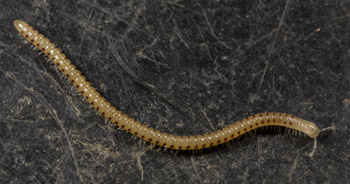 Another common caverniculous species is the blind Spotted Snake Millipede Blaniulus guttulatus. The red spots down the sides are stink glands (ozadenes). This millipede may be more common in caves during winter when the colder temperatures encourage the millipede to go deeper into the soil. A similar spotted species, but with eyes, is likely to be Cylindroiulus sp.