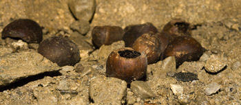 Hazel nuts eaten by woodmice Apodemus sylvaticus, Scoska Cave |