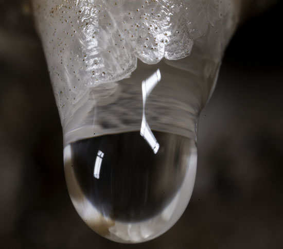 Humidity is constant and very high, usually between 98 and 100%. Near entrances with draughts it may drop to 75%, this is still much higher than the lowest levels recorded outside the cave. The draughts change direction depending on the outside weather. Air moving into the cave in winter may be at a lower temperature than the air in the cave - it will warm up and be able to hold its water vapour. In summer the air flowing into the cave cools down and becomes saturated with water vapour, it condenses on the walls and ceiling of the cave.