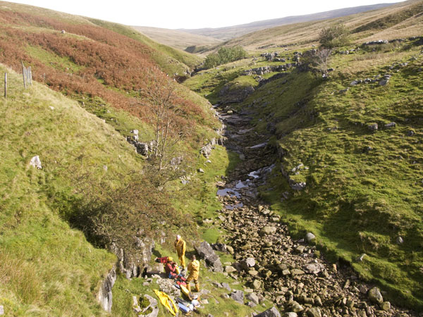 Easegill river bed in dry conditions. There are many cave entrances along the banks of the stream, many of which flood quickly during wet weather. |