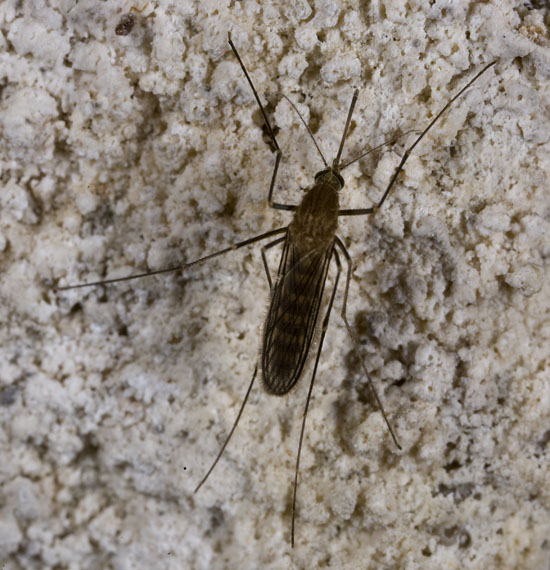 Family CULICIDAE e.g. Common Mosquito Culex pipiens. Those in caves are mostly inseminated females overwintering in the thresholds. They leave the cave in spring for a blood meal, usually from a bird (not from humans). There are several generations a year. Female Culex pipiens with its blood sucking proboscis, Short Drop Cave.