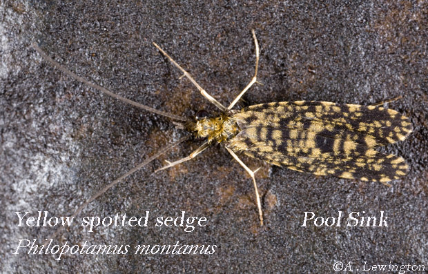CADDIS FLY Plectrocnemia conspersa and P. geniculata larvae spin nets in the stream to capture prey. They can make a number of different types of net depending on the water conditions. The variable net-spinning behaviour enables the caddis population to exploit a wide range of prey and microhabitats. If a sufficient food supply is washed in by the stream these nymphs and larvae can continue to survive underground but as soon as they metamorphose into winged adults they will die as the adult stages often rely on plants for feeding. They have been seen in the streams of Dow Cave, Borrins Moor, Robinsons Pot and Ingleborough Cave. Adult Philopotamus montanus, yellow spotted sedge, are not uncommon in caves.
