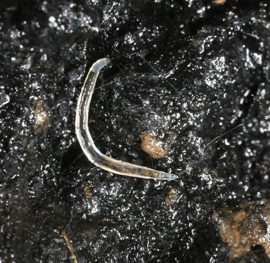 Blackfly (Simulium sp.) larvae are washed in by surface streams. They can be seen anchored to the rocks in the fast flowing streams trying to catch debris as it floats past.