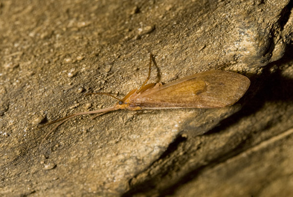 Adults of the large buff coloured caddisfly Stenophylax permistus use the cave threshold as a resting stage for part of the summer (diapause) – a few recordings are from mine levels. Photograph from Scoska Cave.