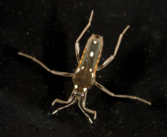 Aquatic Bugs have also been recorded from cave streams and as with the nymphs described above have been washed in from the surface. The Water Cricket Velia caprai (8mm) has been recorded from a variety of caves including Browgill Cave, Goyden Pot, Yordas Cave and Scoska Cave. It is distasteful to predatory fish, engages in kleptoparasitism (takes or shares prey taken by other Water Crickets), and can travel at twice its normal speed by spitting saliva on the water surface. It has a complex life cycle and overwinters in a number of different states (mature, immature, 5th instar larvae and eggs. The adults are found on the water surface but also quite happily climb out onto the walls. The macropterous (large winged) state is rare, probably because when this bug needs to find a new habitat it prefers walking as a mode of dispersal.